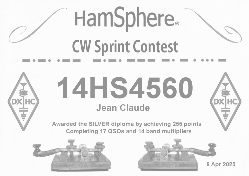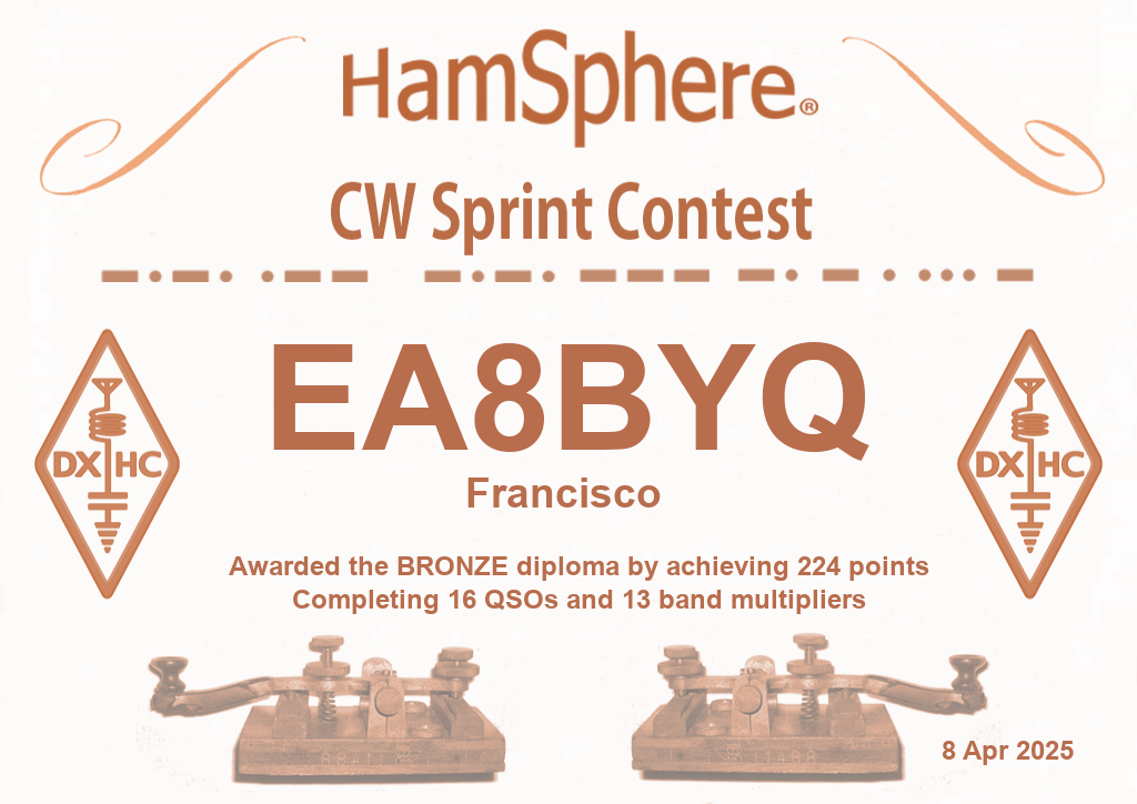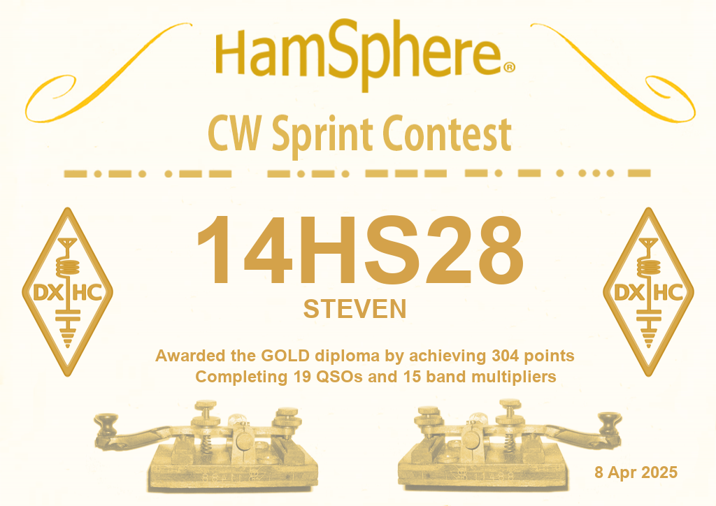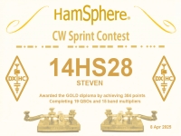 | HamSphere CW Sprint 2025 | 2025-04-06 18:00:00 | 2025-04-06 22:00:00 | 2025-04-08 22:00:00 | VIEW | ||||