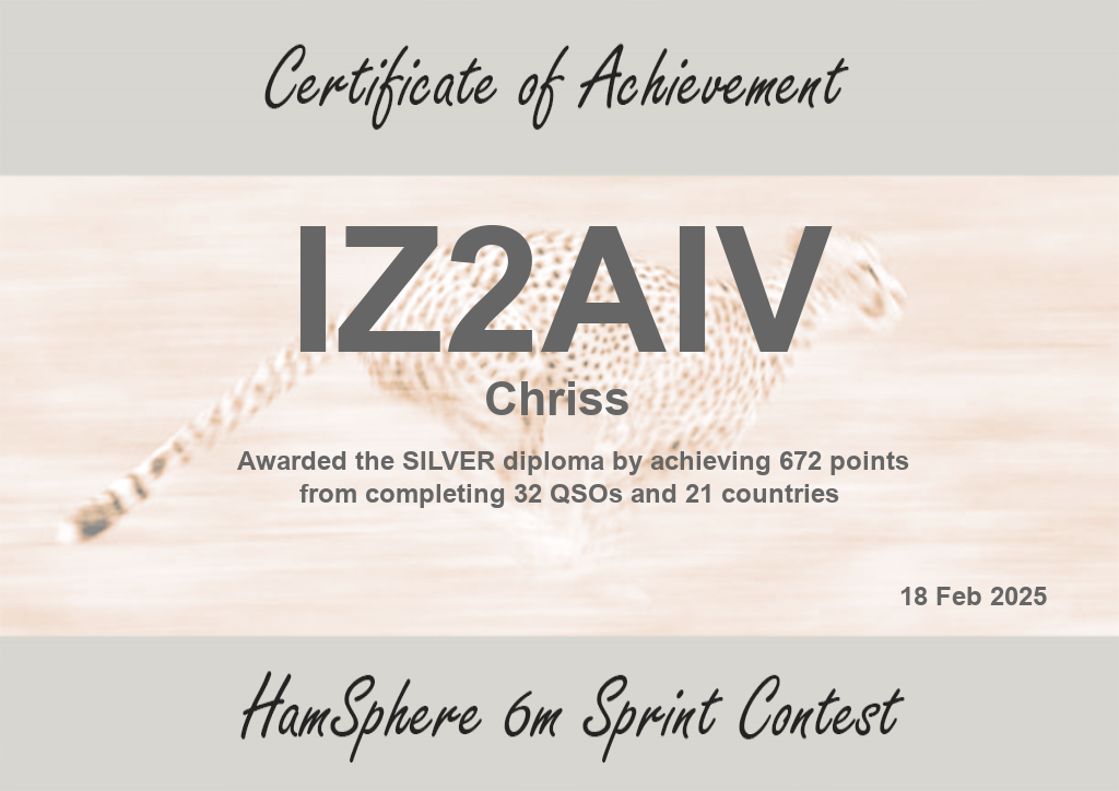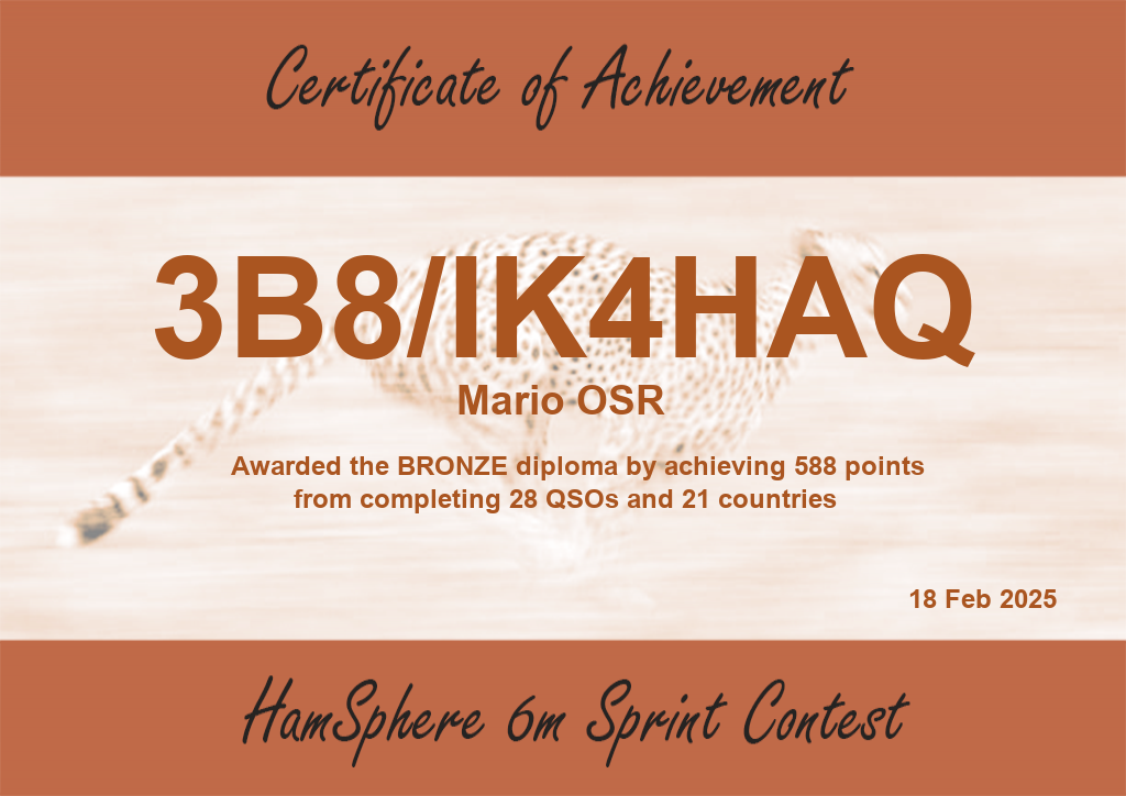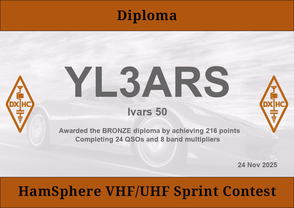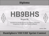 | HamSphere VHF/UHF Sprint Contest 2025 | 2025-11-22 11:00:00 | 2025-11-22 17:00:00 | 2025-11-24 17:00:00 | VIEW | ||||