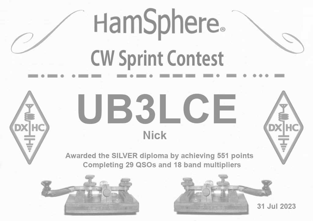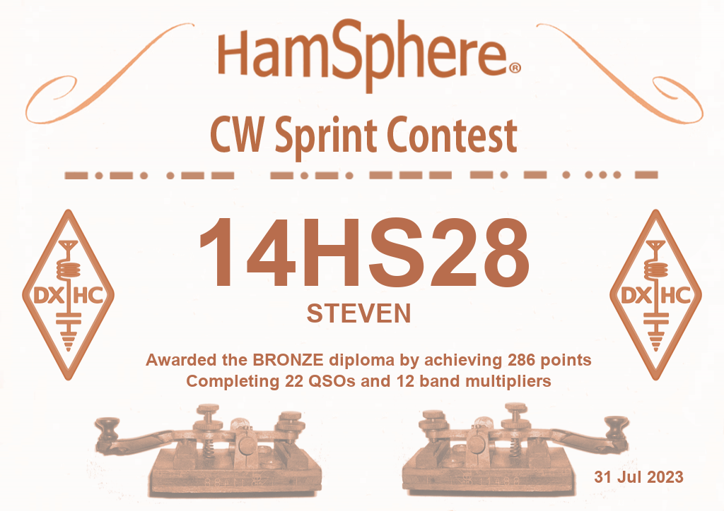 | HamSphere CW Sprint 2023 | 2023-07-30 18:00:00 | 2023-07-30 22:00:00 | 2023-07-31 22:00:00 | VIEW | ||||