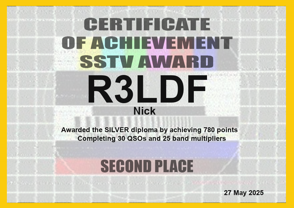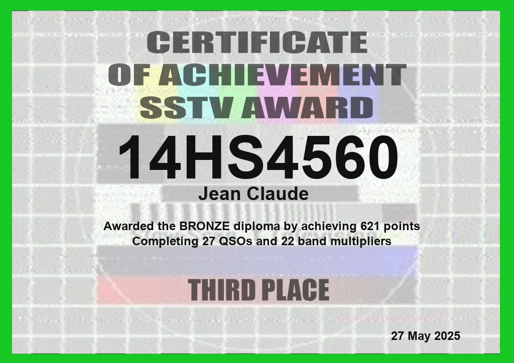 | HamSphere SSTV Contest 2025 | 2025-05-24 04:00:00 | 2025-05-25 04:00:00 | 2025-05-27 04:00:00 | VIEW | ||||