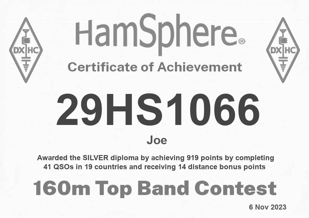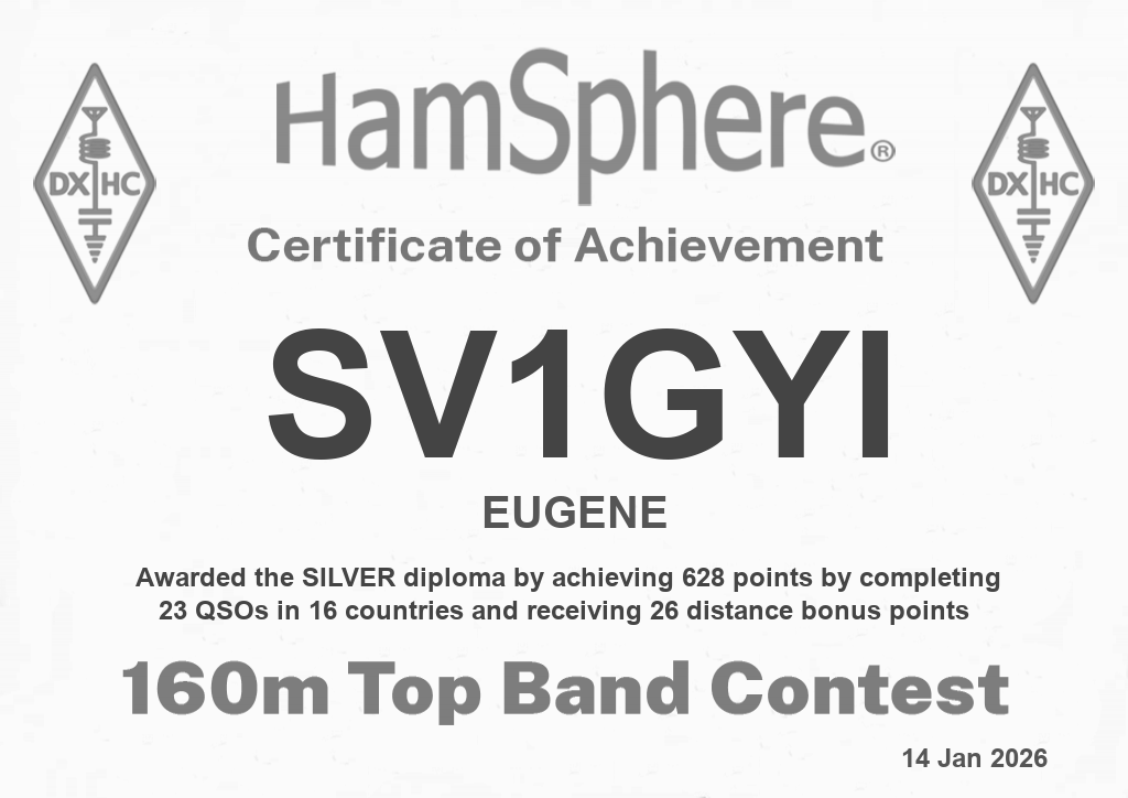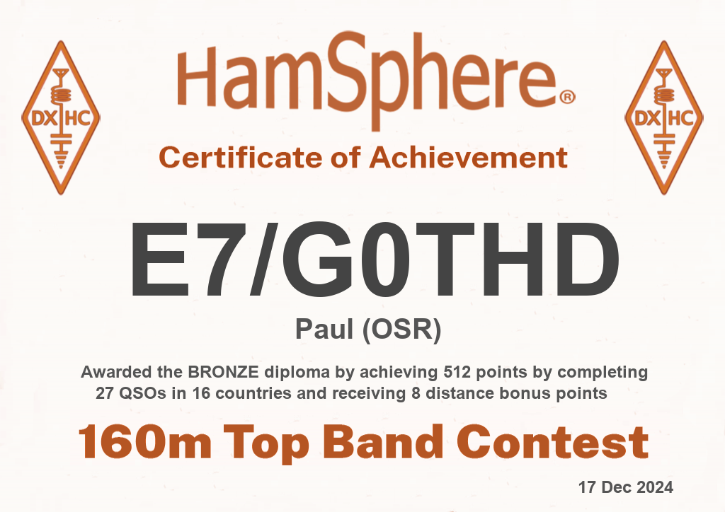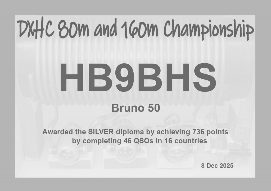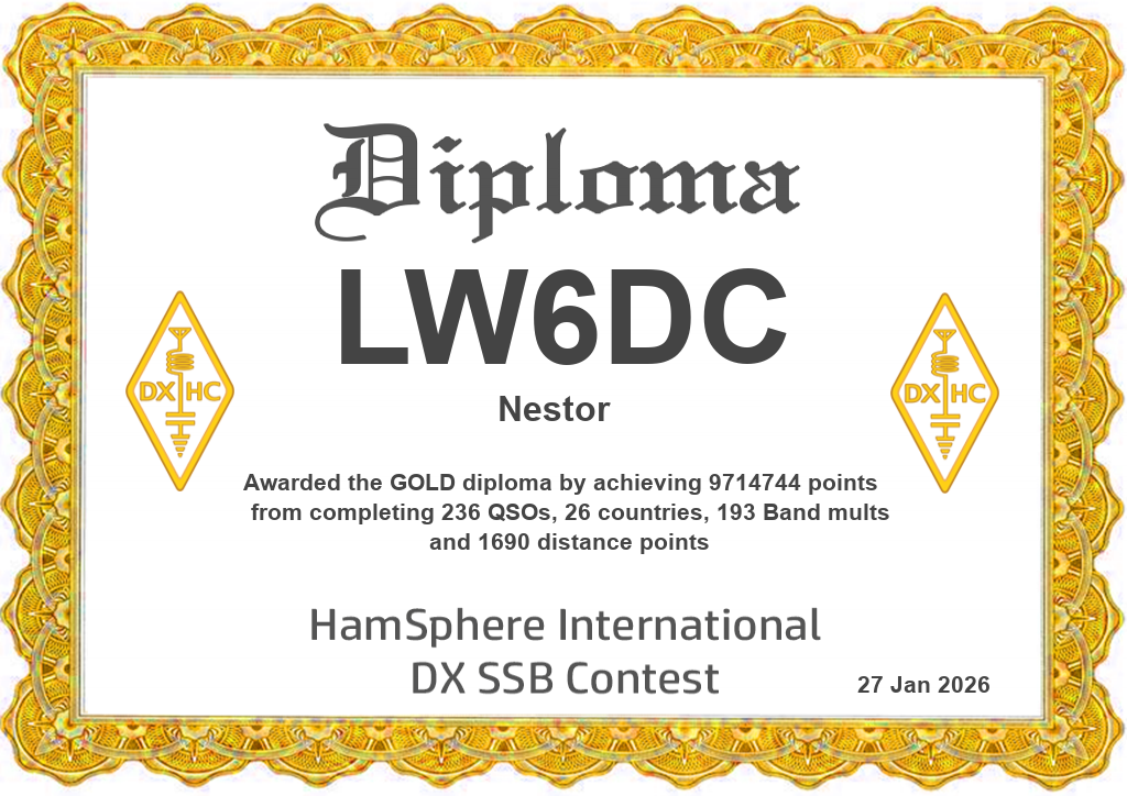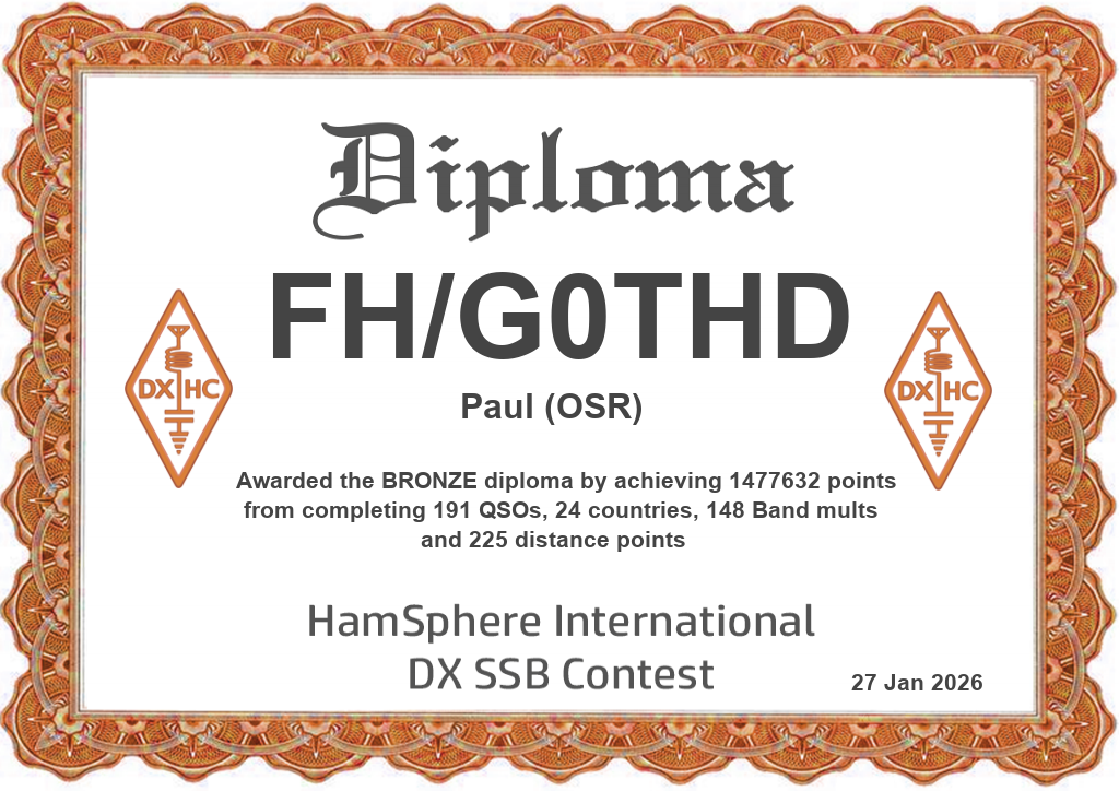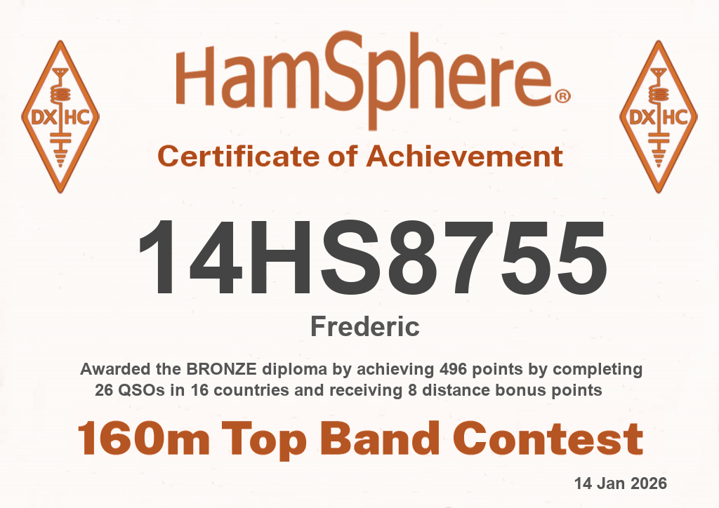 | HamSphere DXHC 80m and 160m Championship 2025 | 2025-12-06 06:00:00 | 2025-12-07 06:00:00 | 2025-12-08 12:00:00 | VIEW | ||||