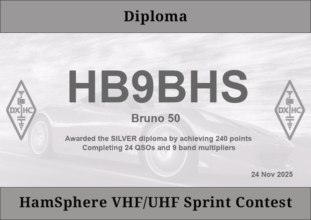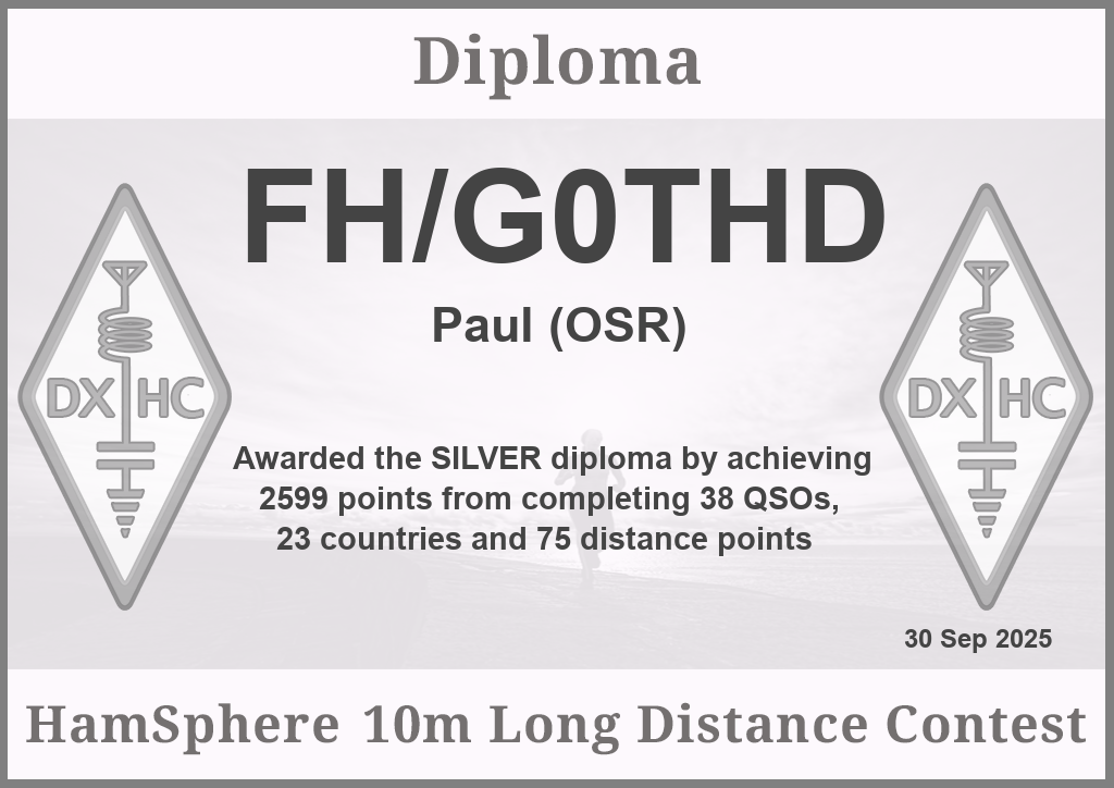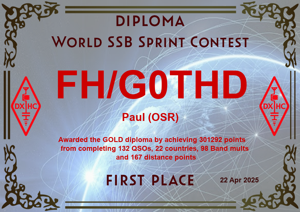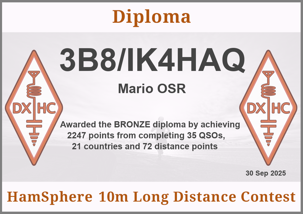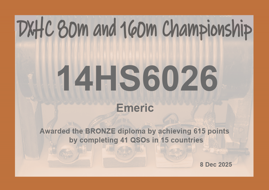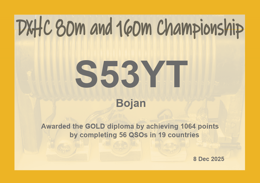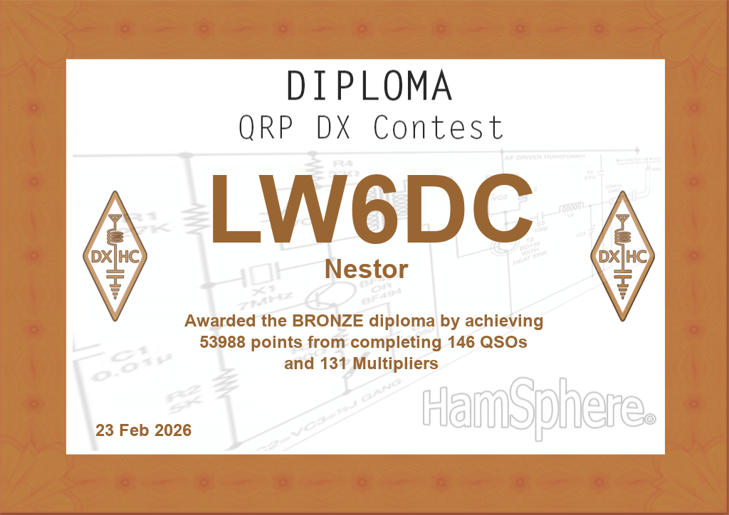 | HamSphere DXHC 80m and 160m Championship 2025 | 2025-12-06 06:00:00 | 2025-12-07 06:00:00 | 2025-12-08 12:00:00 | VIEW | ||||