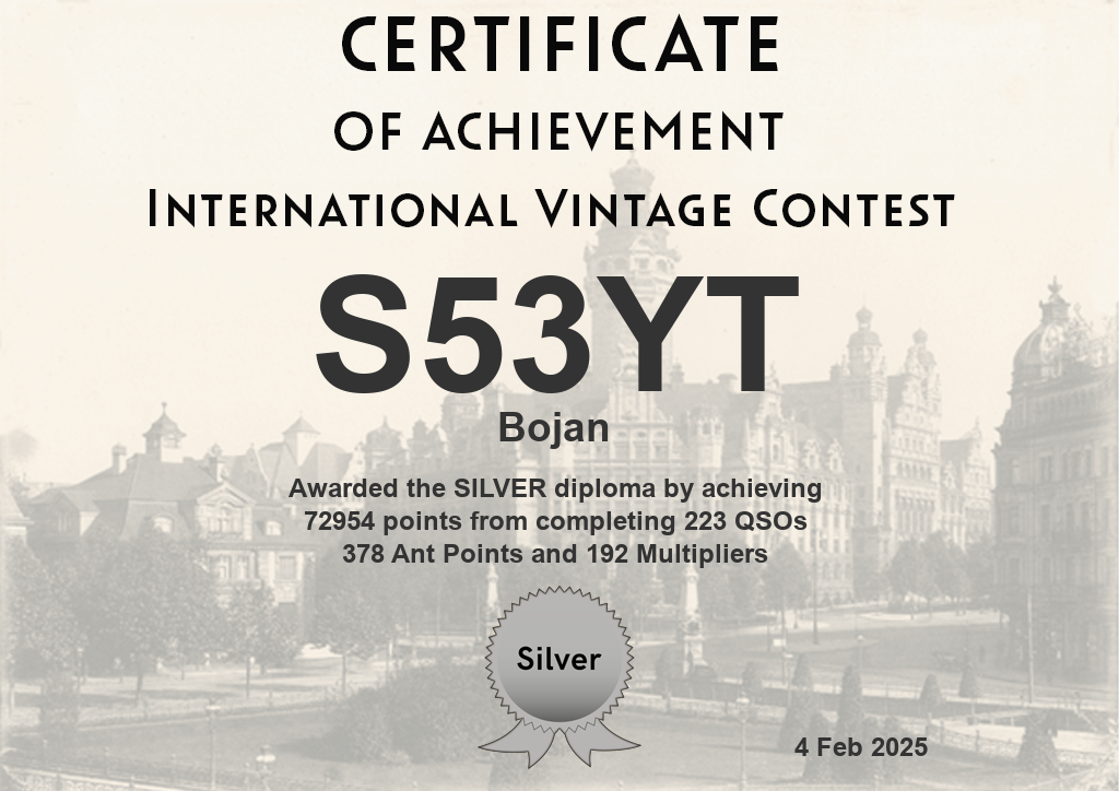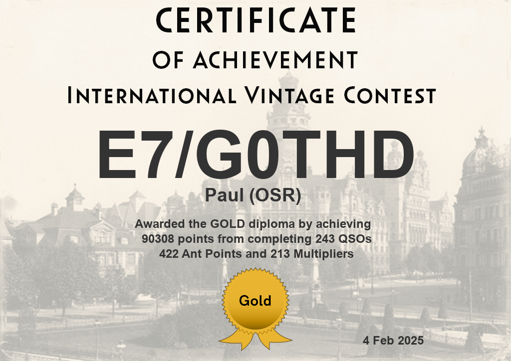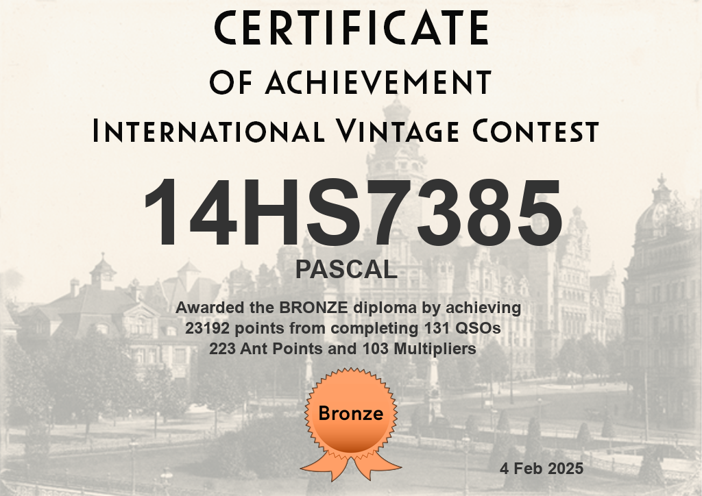 | HamSphere International Vintage Contest HF 2025 | 2025-02-01 06:00:00 | 2025-02-02 06:00:00 | 2025-02-04 06:00:00 | VIEW | ||||