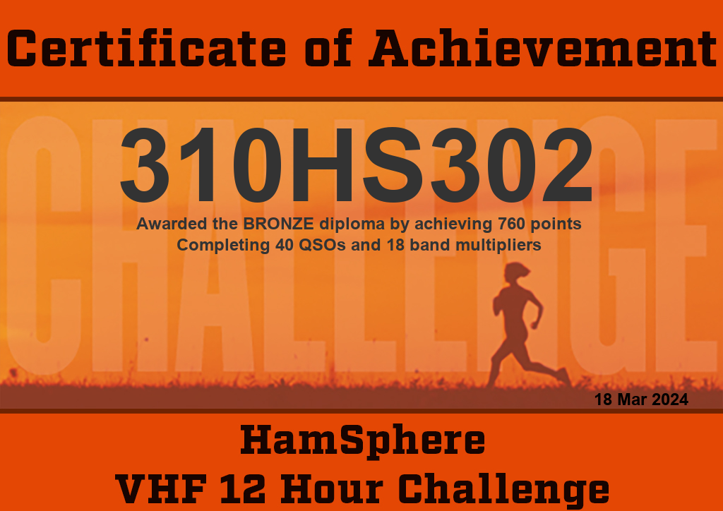 | HamSphere VHF 12 Hour Challenge 2024 | 2024-03-16 11:00:00 | 2024-03-16 23:00:00 | 2024-03-18 00:00:00 | VIEW | ||||