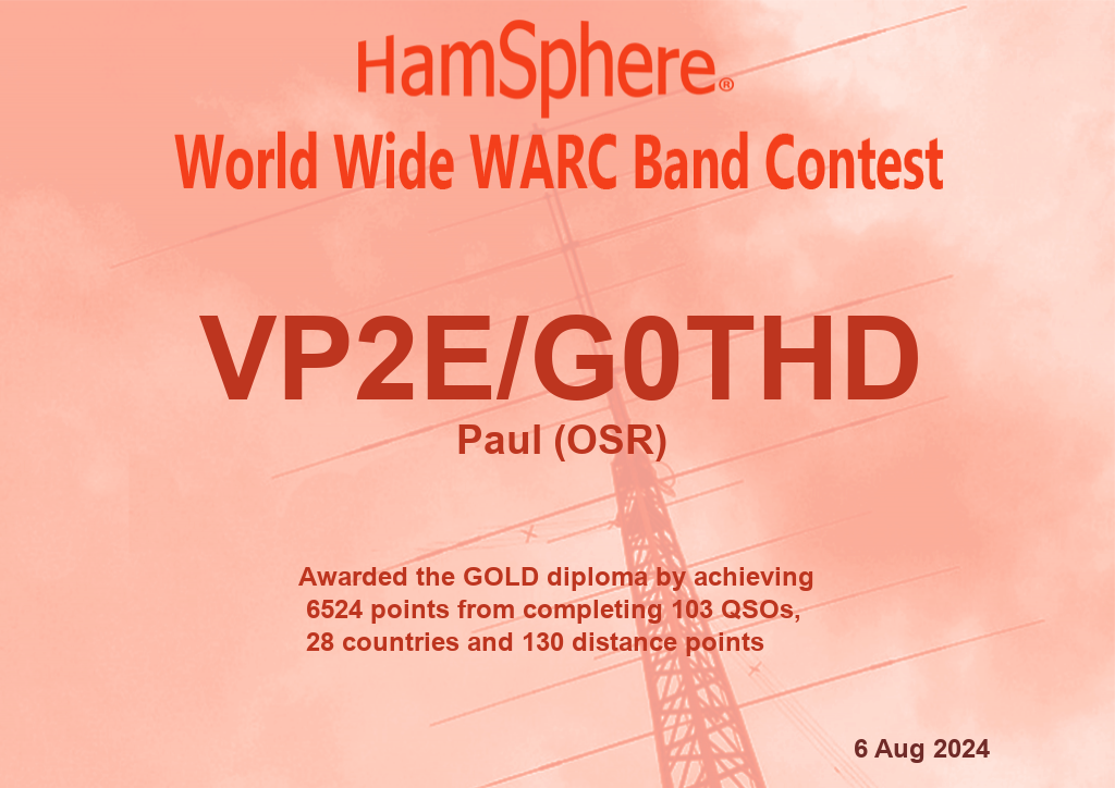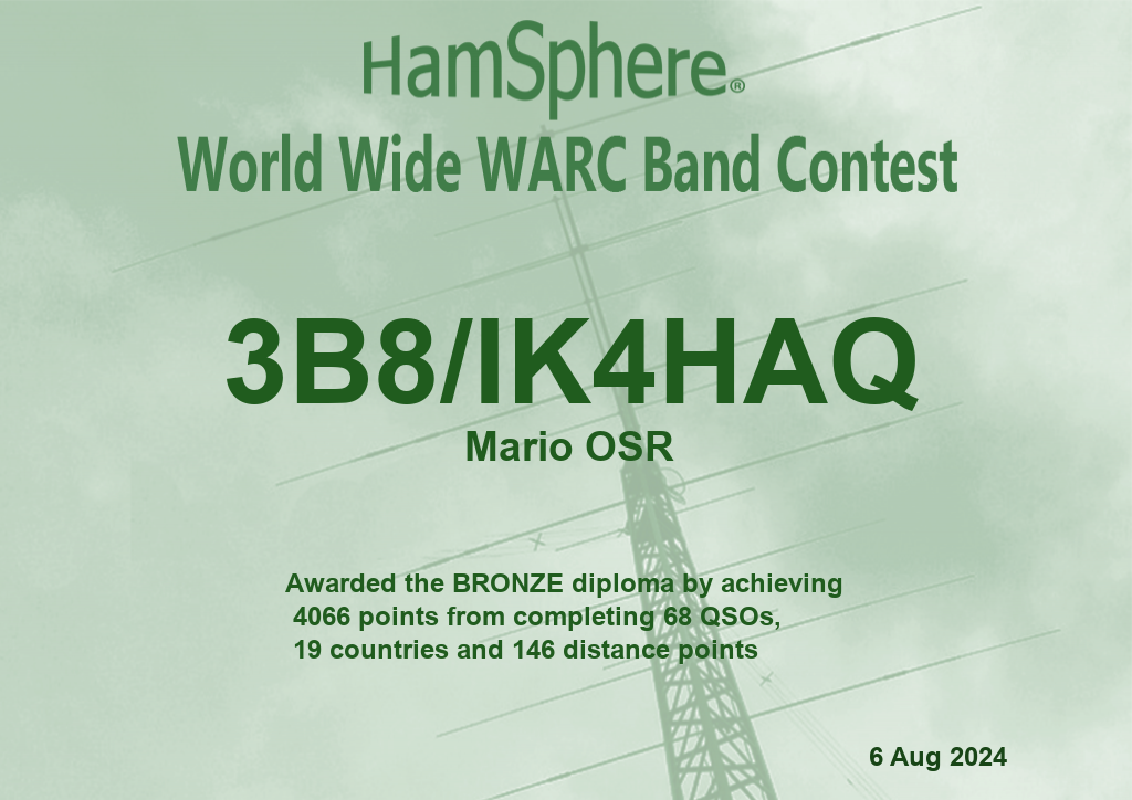 | HamSphere World Wide WARC Band Contest 2024 | 2024-08-03 06:00:00 | 2024-08-04 06:00:00 | 2024-08-06 00:00:00 | VIEW | ||||