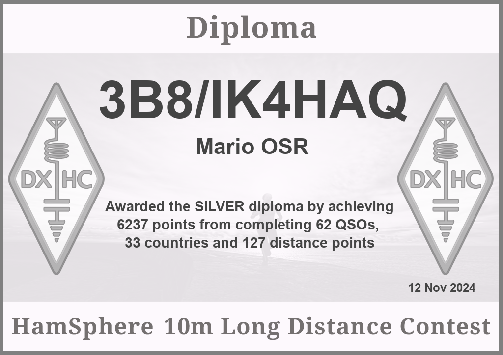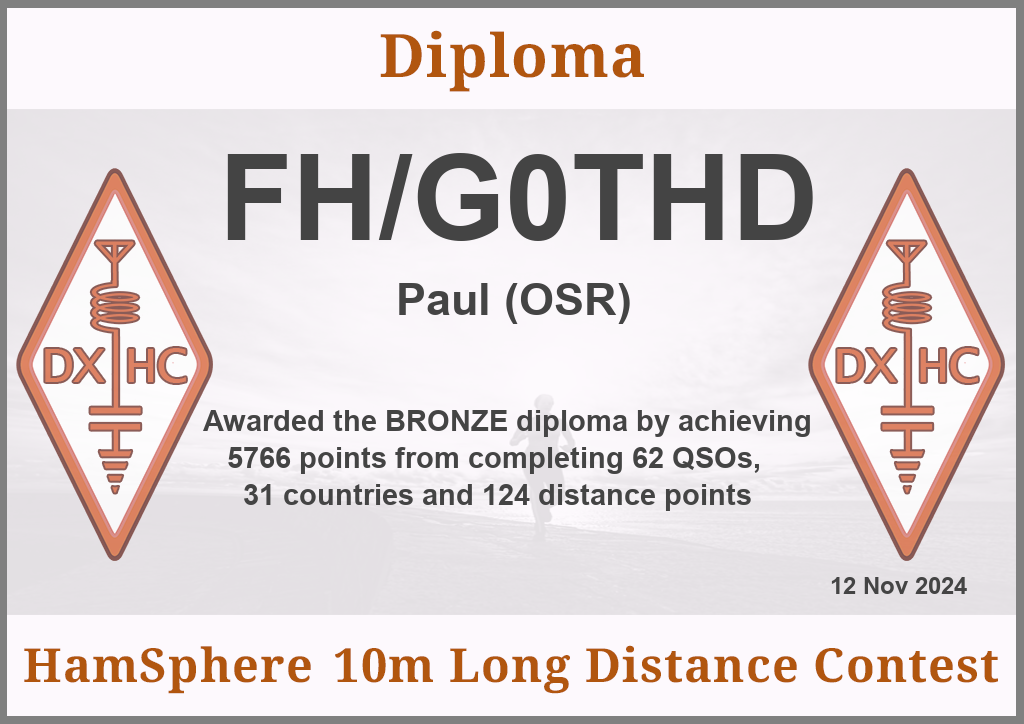 | HamSphere 10m long distance contest 2024 | 2024-11-09 10:00:00 | 2024-11-10 10:00:00 | 2024-11-12 00:00:00 | VIEW | ||||