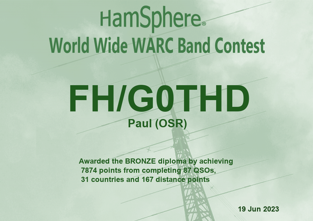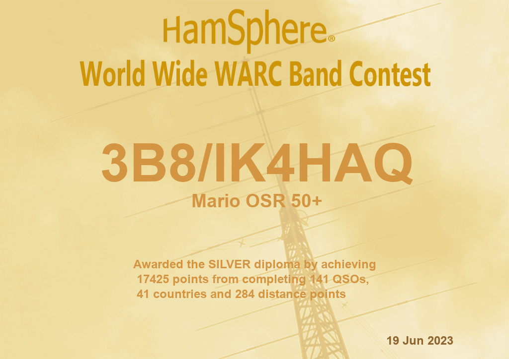 | HamSphere World Wide WARC Band Contest 2023 | 2023-06-17 12:00:00 | 2023-06-18 12:00:00 | 2023-06-19 12:00:00 | VIEW | ||||