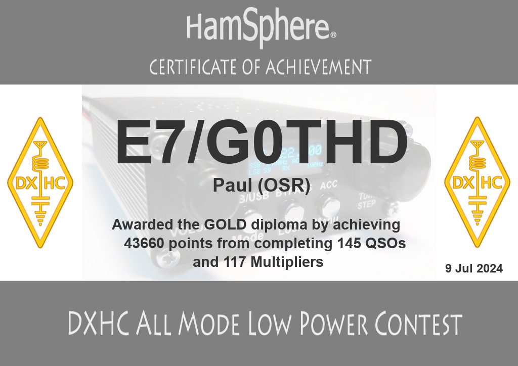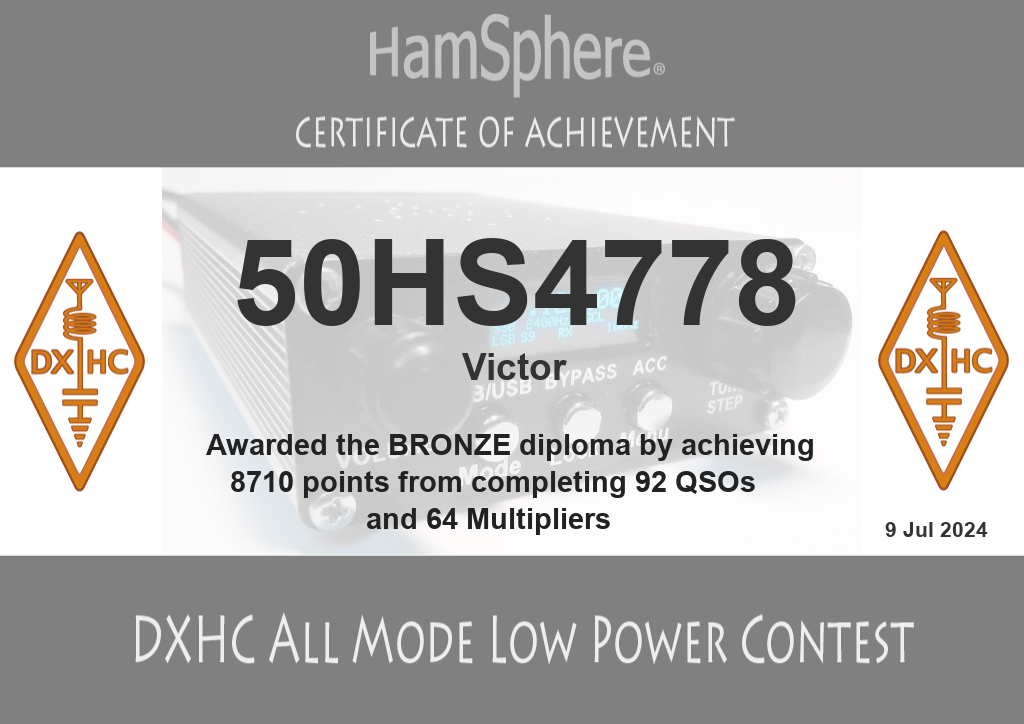 | HamSphere DXHC All Mode Low Power Contest 2024 | 2024-07-06 12:00:00 | 2024-07-07 12:00:00 | 2024-07-09 00:00:00 | VIEW | ||||