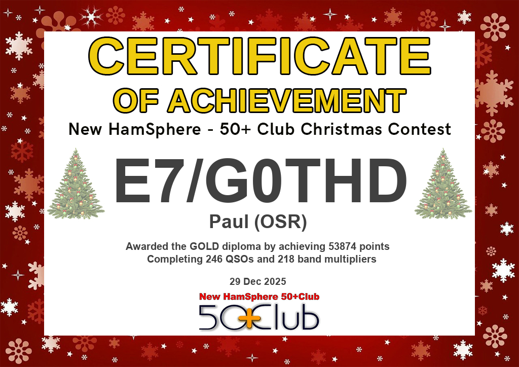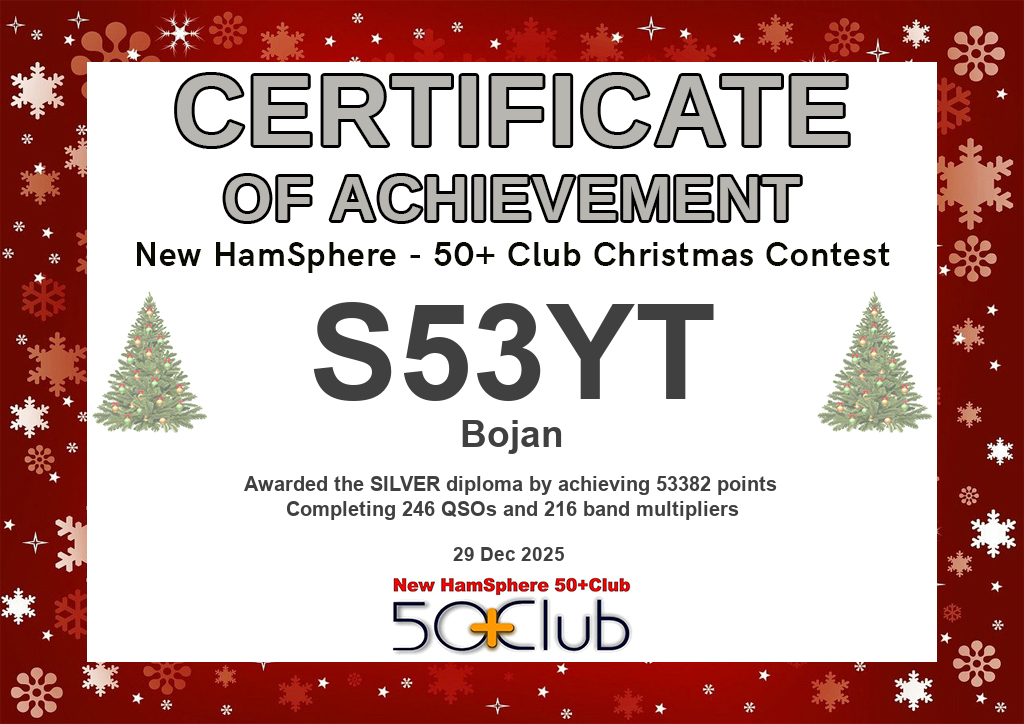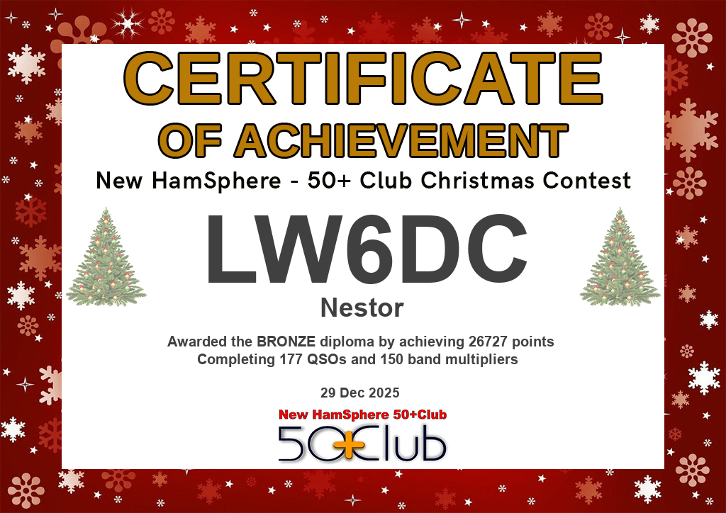 | New HamSphere 50 Plus Club 24 hour Christmas contest 2025 | 2025-12-27 00:00:00 | 2025-12-28 00:00:00 | 2025-12-29 00:00:00 | VIEW | ||||