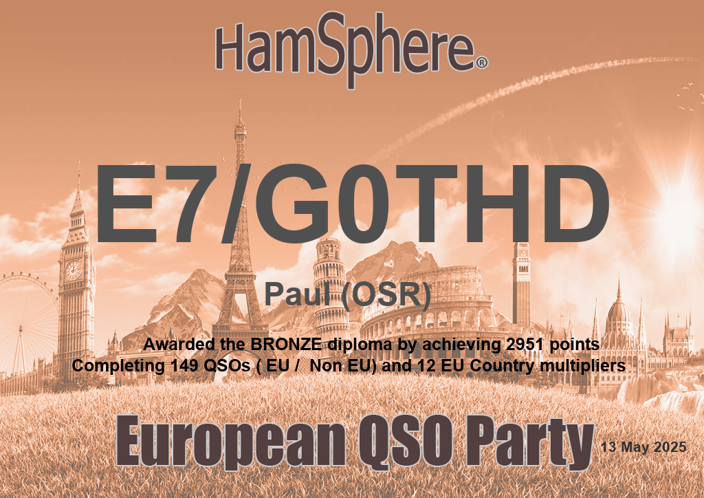 | HamSphere European QSO Party 2025 | 2025-05-10 06:00:00 | 2025-05-11 06:00:00 | 2025-05-13 06:00:00 | VIEW | ||||