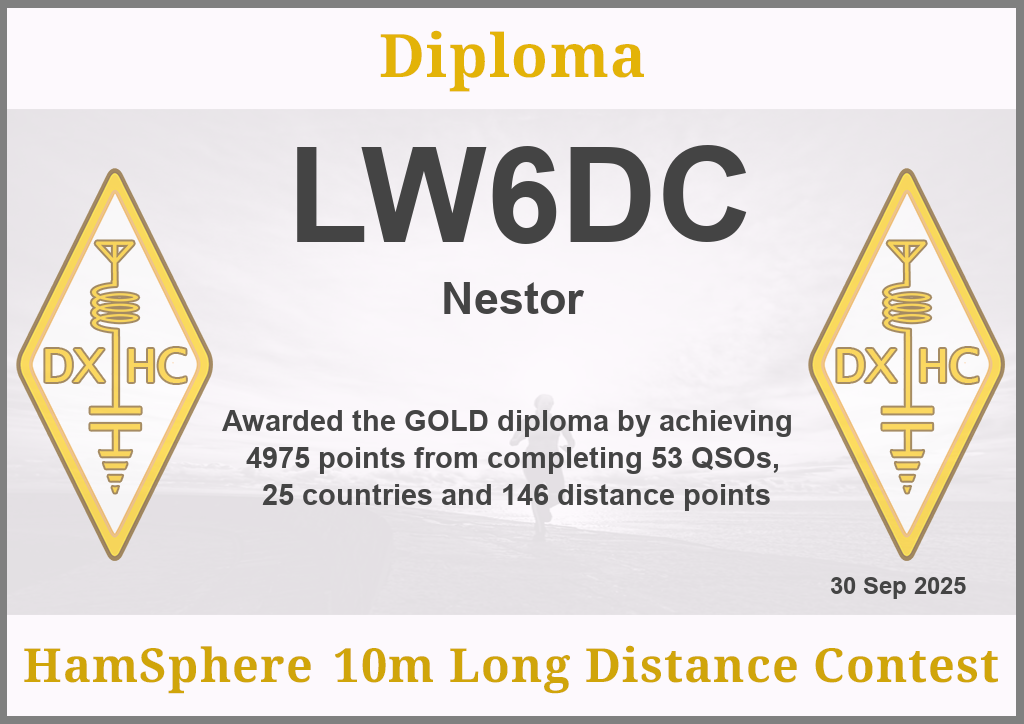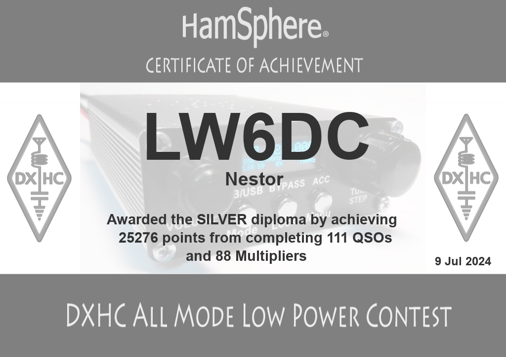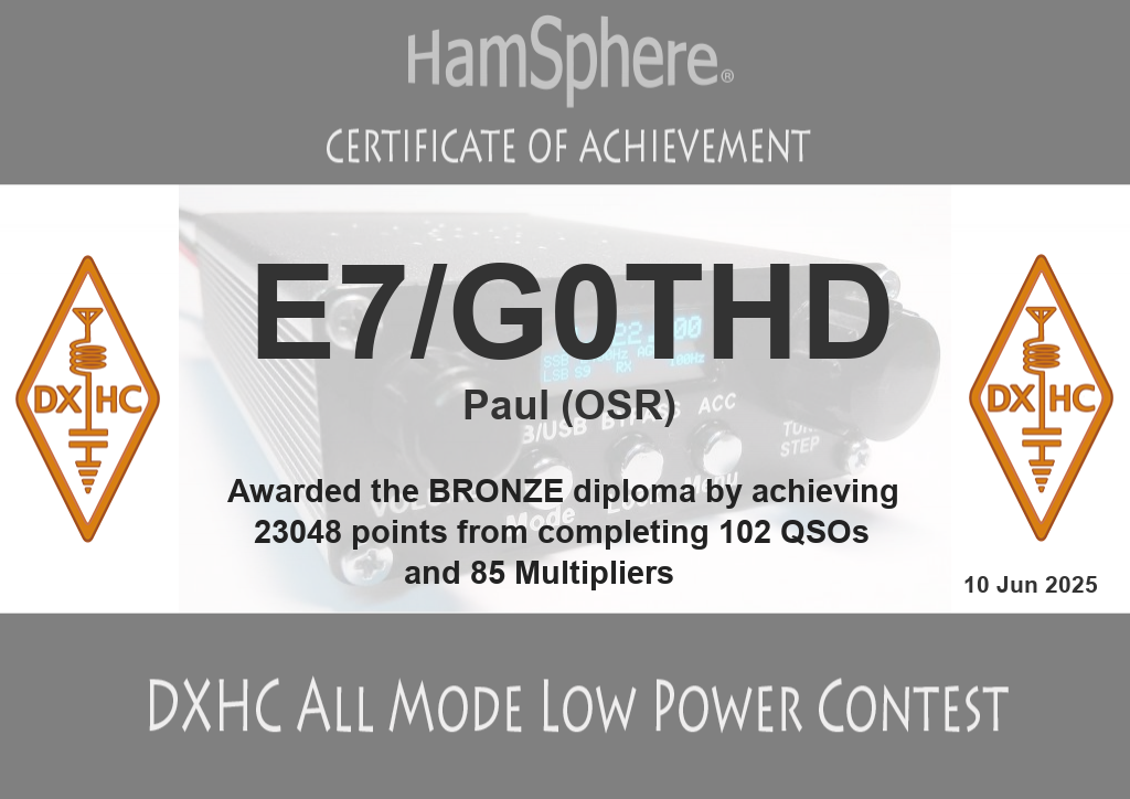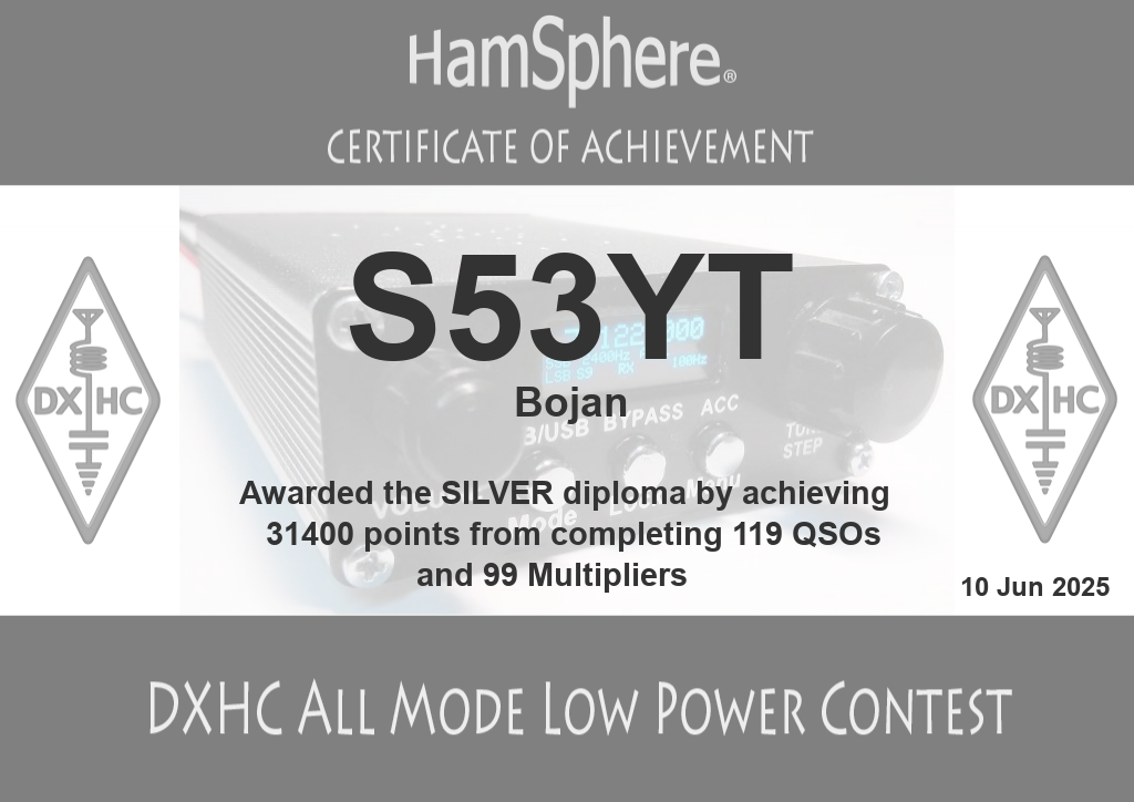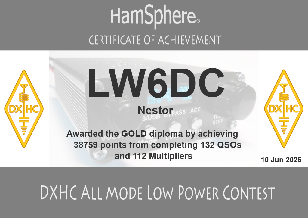 | HamSphere DXHC All Mode Low Power Contest 2025 | 2025-06-07 00:00:00 | 2025-06-08 00:00:00 | 2025-06-10 00:00:00 | VIEW | ||||