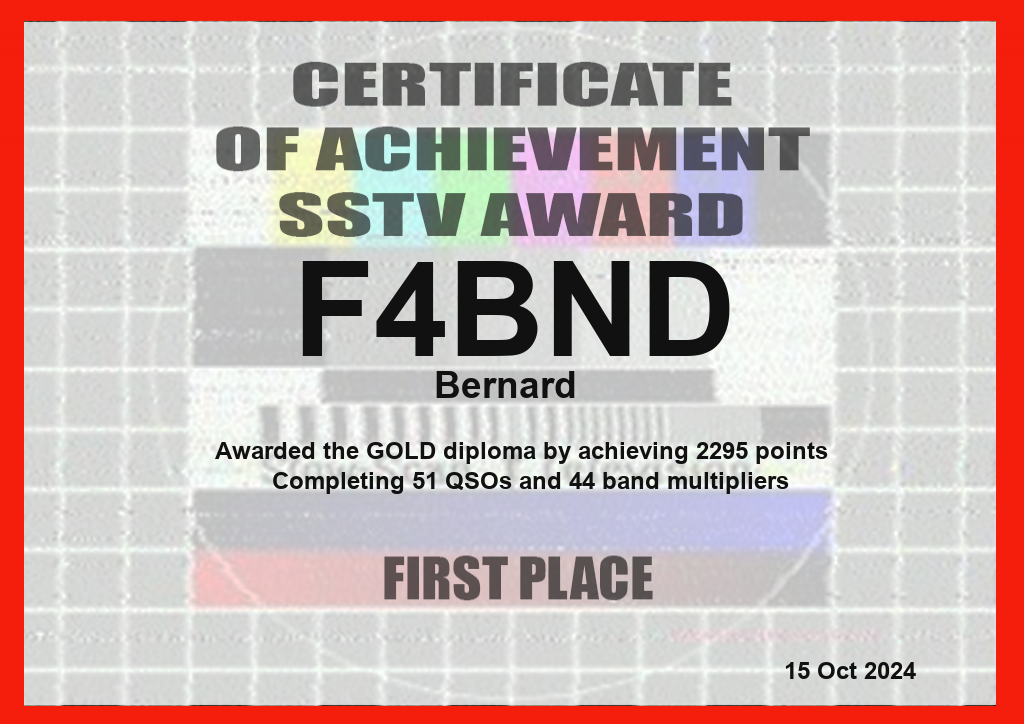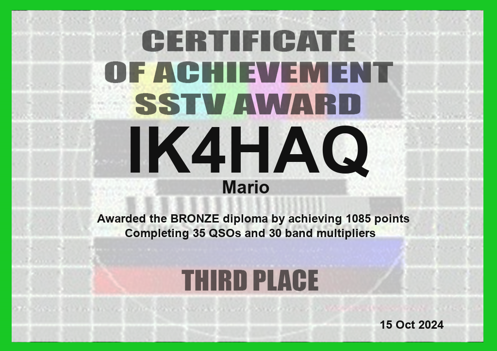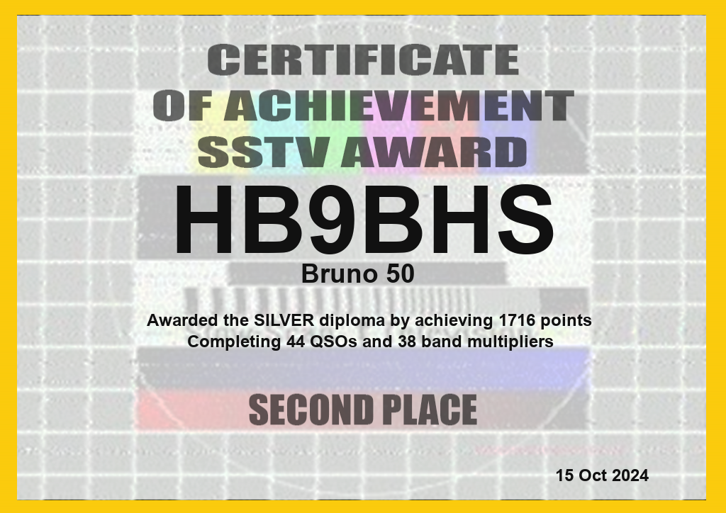 | HamSphere SSTV Contest 2024 | 2024-10-12 04:00:00 | 2024-10-13 04:00:00 | 2024-10-15 00:00:00 | VIEW | ||||