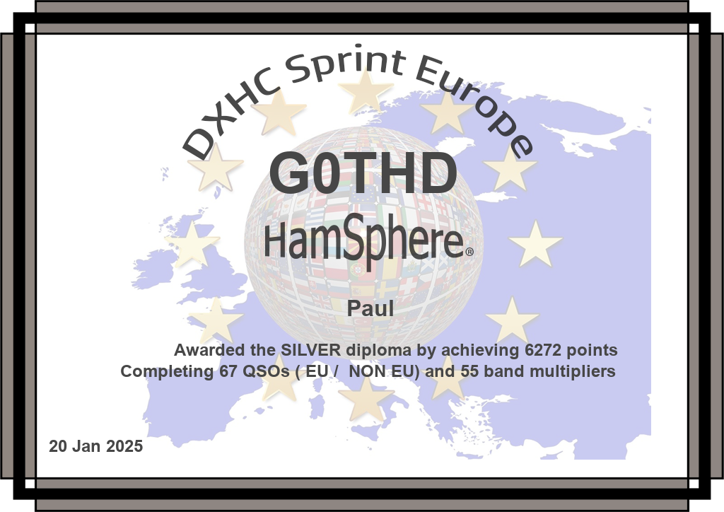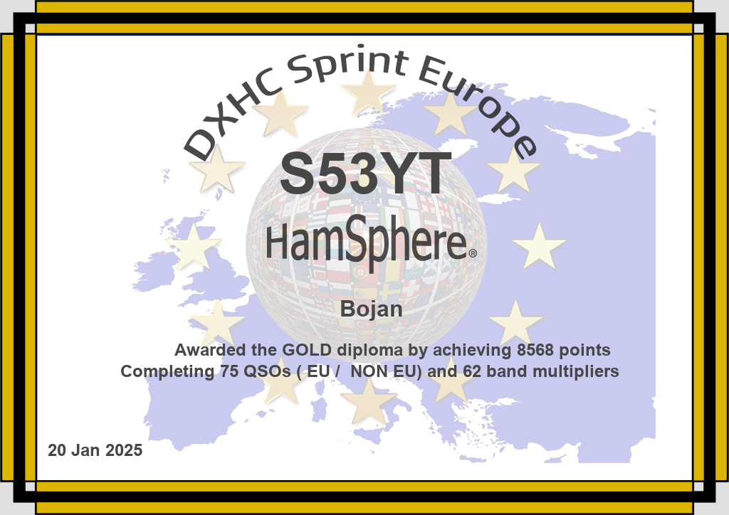 | HamSphere DXHC Sprint Europe 2025 | 2025-01-18 19:00:00 | 2025-01-18 23:00:00 | 2025-01-20 23:00:00 | VIEW | ||||