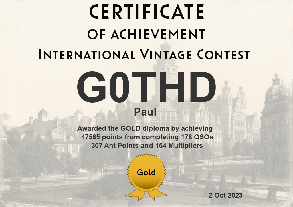 | HamSphere International Vintage Contest HF 2023 | 2023-09-30 06:00:00 | 2023-10-01 06:00:00 | 2023-10-02 06:00:00 | VIEW | ||||