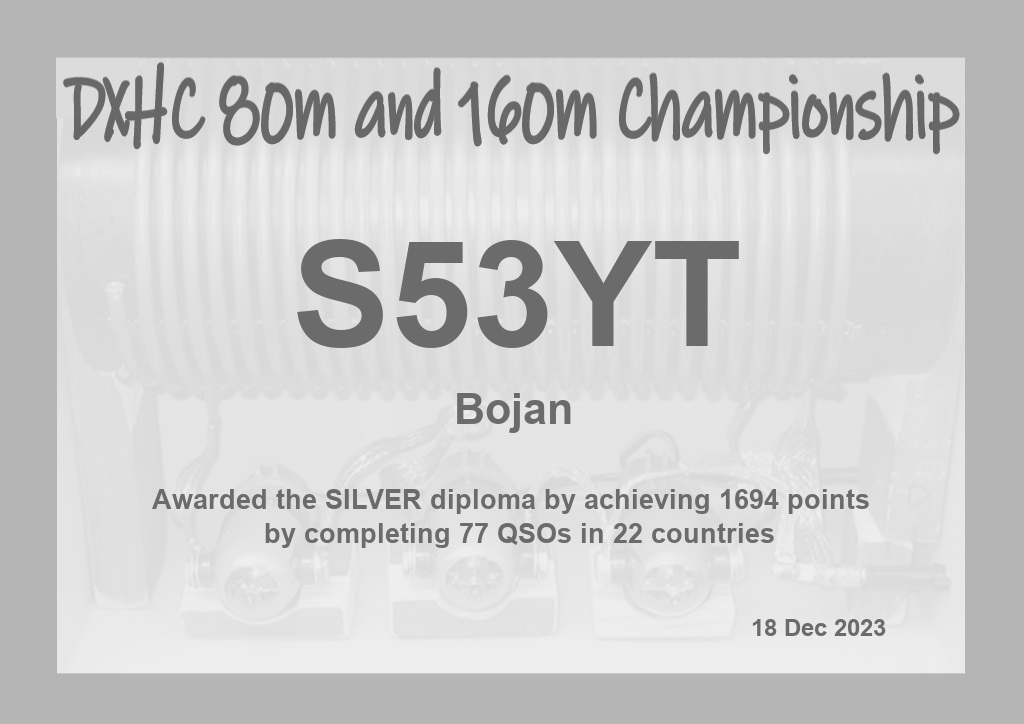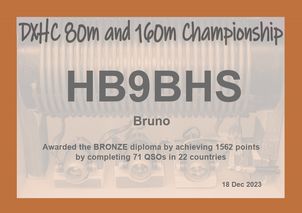 | HamSphere DXHC 80m and 160m Championship 2023 | 2023-12-15 21:00:00 | 2023-12-16 21:00:00 | 2023-12-18 00:00:00 | VIEW | ||||