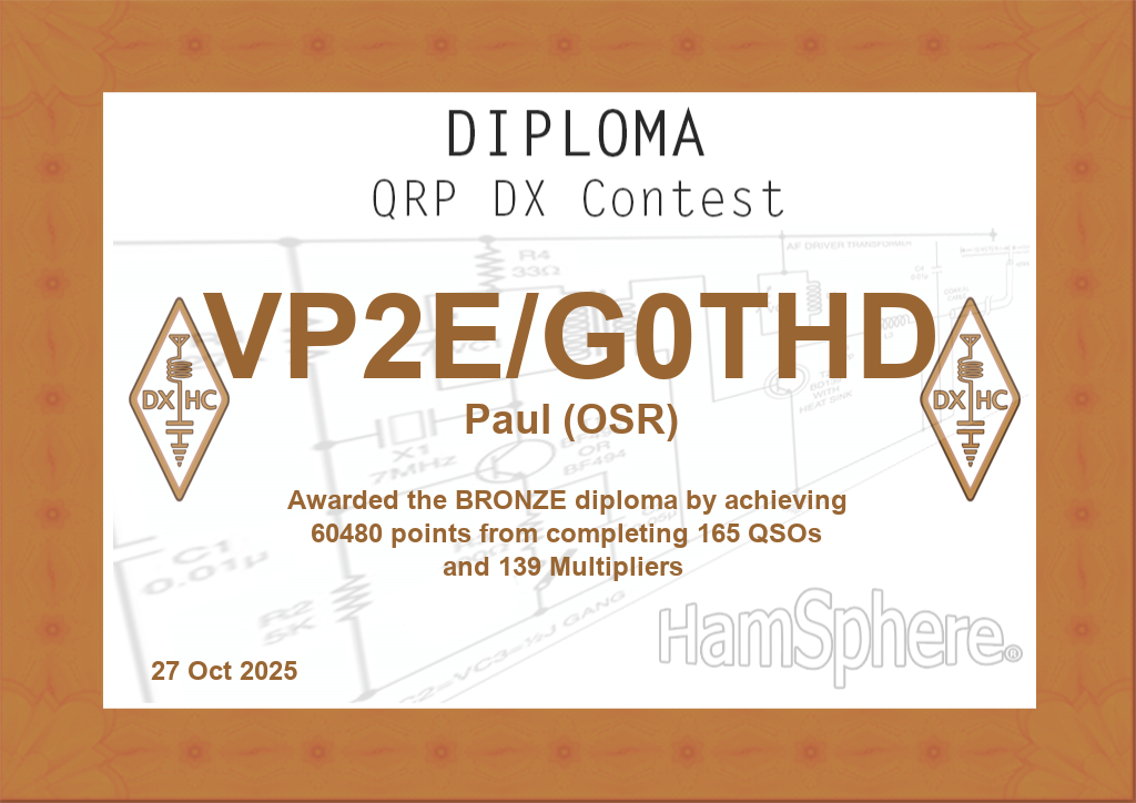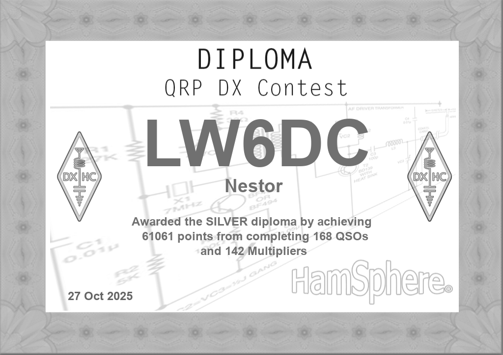 | HamSphere QRP DX Contest 2025 | 2025-10-25 00:00:00 | 2025-10-26 00:00:00 | 2025-10-27 00:00:00 | VIEW | ||||