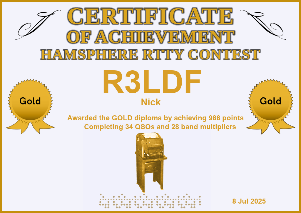 | HamSphere RTTY Contest 2025 | 2025-07-05 10:00:00 | 2025-07-06 10:00:00 | 2025-07-08 10:00:00 | VIEW | ||||