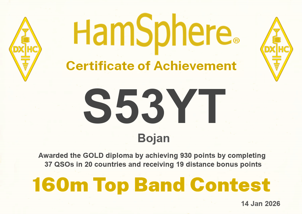 | HamSphere Top band contest 2026 | 2026-01-10 00:00:00 | 2026-01-11 00:00:00 | 2026-01-14 22:00:00 | VIEW | ||||