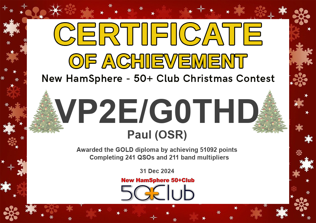 | New HamSphere 50 Plus Club 24 hour Christmas contest | 2024-12-28 00:00:00 | 2024-12-29 00:00:00 | 2024-12-31 00:00:00 | VIEW | ||||